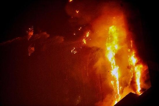 記者在凌晨1點多趕到現場的時候,南邊152米高的B座公寓已經全部的燃燒,而且當時火光沖天不時有燃燒物體往下凋落,上百名群眾在馬路對面圍觀。當時已經調集200多輛消防車和警方集結在周圍待命,但由于現場當時火勢較猛,而且云梯車的高壓水槍只能噴射到50-60米的高度,也就是十層左右,再往上的火勢根本無法控制了,只能看著其燃燒。